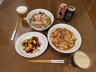 NEW ある日の夕食〈160〉 麻婆豆腐⬜️🐷塩こん部長のさつまいもバター🍠🧈サニーレタス・キュウリ・カニカマのサラダ🥗【お酒】サッポロラガービールヱビス プレミアムブラック老松酒造 大分麦焼酎