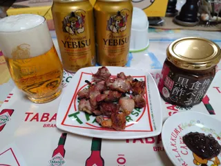 ヱビスバーKぶらっと京橋から帰宅後 ヱビスバー帰り京阪百貨店によって名古屋コーチンのもも肉がお安くなってましたので購入してグリル焼きにしてもらいましたヱビスバーの鹿児島フェアで使われている 桷志田 食べる黒酢ちょい辛これがよく合います😋
