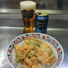 小海老、イカ、ふきのとう、たまねぎで、かき揚げ丼を作りました🎵ふきのとうが入ると春っぽさを感じます。新玉ねぎがあったらもっと良かったかな。今日のビールは東京クラフトでした。🍺😆👍