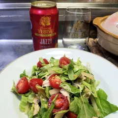 🎷Jazzyと夕食🎷 夕食はヱビスクリエイティブブリューJAZZYに、サラダともつ煮込みです🎵🍺👍 最近トマト🍅がかなり高価になっていますが、安くなっていたので久しぶりに生を買ってサラダ🥗に入れました🎵