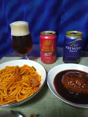 今日はJAZZYとプ◯モルの新柄でナポリタン 風とハンバーグでした。JAZZYでナポリタン風とハンバーグ、いい感じでした。他社製品ですけどプ◯モルの新柄、これも、いい感じでした。ナポリタンふにハンバーグ なんて なんか 子供のメニューみたいですけど美味しくいただきました。ごちそうさまでした🙏😎👍。