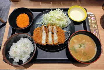 "大麦豚”厚切りリブロースかつ定食豚汁セット🥩 昨日は午後遅いランチに松のや🍴期間限定"大麦豚”厚切りリブロースかつ定食豚汁セットをライス小盛、無料サービス券でコロッケを付けて🥩肉は150gでボリューミー、かつ美味い😋150gでボリュームたっぷり🥩