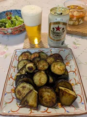 赤星✕茄子焼き 赤星で乾杯🍻 昨日は野菜室の在庫整理をば茄子は夫リクエストの素焼きに、小松菜は鷹の爪を入れてピリ辛炒めにして。そして、麻婆豆腐残りと前日に作ったビーフシチューをいただきました美味しかったです ご馳走さまでした🙏