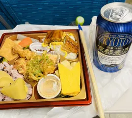 新幹線で(京都旅行の帰り) 新幹線で美味しいお弁当を食べながら、ご当地ビールを頂きました。幸せ^_^❣️
