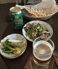 旬のヱビスと豆ごはんと焼き鯛