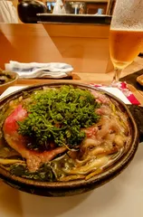 YEBISUにあう「花山椒」鍋🍲 ■店舗名:松まつもと■エリア: 目黒区/中目黒■おすすめの一品:「花山椒鍋🍲」長野県大鹿村から採れたての花山椒と山菜、山野草とA4和牛がたっぷり入り、拘りの黒七味でいただく期間限定の鍋、YEBISUを片手に新年度のバタバタの日々が癒されるー!昨晩は肉厚の鯵にYEBISUが沁みた。しばらくはバタバタの