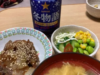 今夜は牛バラ肉と玉ねぎの照り焼きで 今夜は冬物語、ヱビス以外のサッポロビールを楽しみました。照り焼きは、牛肉にあらかじめ片栗粉をまぶして、玉ねぎと一緒に炒めたあとに、醤油と酒とみりんと砂糖で味付けします。片栗粉でとろみが出るので、冷めてくると肉がくっついてしまいます。温かいうちに食べないと塊になっちゃうのが、イヤなところです。&nbs