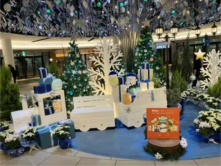 ホワイティ梅田の泉の広場のすみっコぐらしはシルバーとブルーキラキラと綺麗です とんかつはちゃんとからしとソースを持ってるのがキュートがすぎるボールの飾りに混ざってるホコリ発見