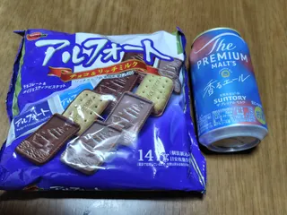 昨日は 昨日は無料クーポンで貰ったプレモルと🍺 アルフォートで😋