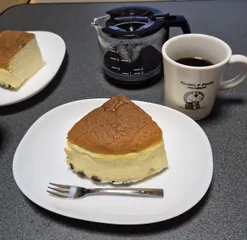 今日のつまみ 右下は胡瓜竹輪で、その上はカボチャの天ぷらと、海老焼売です。真ん中下は豚肩ロースの生姜焼きで、その上は焼きそばです。左下は鮟鱇肝のポン酢で、その上は鮭のアラの煮付けです。 デザートは成城石井の「生プレミアムチーズケーキ」です。