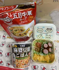 今日のランチ~麻婆豆腐ごはん~ 少し前、ファミマで棚外れ全品半額コーナーに麻婆豆腐ごはんがポツンと佇んでるのを発見👀!まだ、普通にスーパーでは陳列商品なのに見切り早いですね😅賞味期限も今年6月だし、ありがたくお弁当に持って行きます。おかずはシャウエッセンと甘い玉子焼き、トマトと玉ねぎのチーズ焼き🍳🍅🧅🧀汁物は五目中華で😆👌