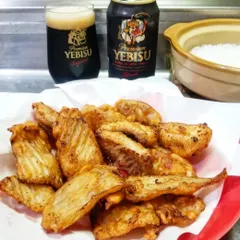 カスベのから揚げを作りました🎵種類はわからないですが、生のエイヒレです。しっかり下味をつけて、米粉&片栗粉で二度揚げです。コリコリの軟骨とふわふわの身の二つの食感が楽しめます。おつまみに最高ですね🍺😋👍お供には、ヱビスプレミアムブラック🍺醤油にんにく生姜の濃い味にぴったりですよ‼️