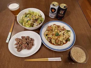 ある日の夕食〈181〉 回鍋肉🥬🐖🫑砂肝のスタミナ炒め🐔🧄サニーレタス・レタス・キュウリ・しらすのサラダ🥗【お酒】サッポロ黒ラベルヱビス プレミアムブラック老松酒造 大分麦焼酎