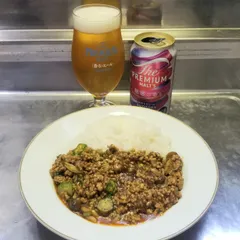 NEW 🍛豚挽肉カレー🍛 豚挽肉にオクラ、ぶなしめじのカレーライス。赤ワインとトマトを効かせ、辛さはとってもマイルドにしました。 プレモル魅惑の香りと一緒に。