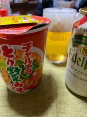 今夜の晩酌の〆はYEBIつよ推しの 地元ソウルフード まつやとり野菜みそ×明星さんの コラボラーメン 「チャルメラとり野菜みそピリ辛ラーメン」とエーデルピルスで〆たいと思います♬😋ちょっと食べた後に撮り忘れに気づく🤣💦さほど辛くもなく程よ