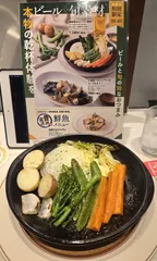 春野菜のオーブン焼き 銀座ライオン3.4月期間限定メニュー🦁春キャベツ、菜の花、スナップエンドウ、新じゃが、新たまねぎ、カブ、人参、バーニャカウダソースで食べます。何も付けずに、そのままでも野菜の甘味旨味があって美味しかったです😊