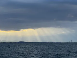 「エンジェル・ラダー(Angel's ladder)」と蜃気楼。 久しぶりに海を見た。 素晴らしい「エンジェル・ラダー(Angel's ladder)」あるいは「ジェイコブズ・ラダー」と呼ばれる現象。😻そして、その下海面には小さい蜃気楼。 自然は素晴らしいね。👍 北陸特有のどんよりした天気だけどね。😭