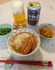 冬物語✕新玉ねぎとソーセージのポトフ風とおつまみ2種 久しぶりに一人お家居酒屋🏮開店~冬物語で乾杯🍻 昨日は夫、飲み会でして夜一人だし何にしようかな~と出かけたついでにスーパーでお惣菜でも。。と思っていたのにスコーンと忘れ、そのまま自宅に戻り。さて、どうしよう。。と野菜室を覗きましたら、お~そう言えば新玉ねぎがある。。よし!炊くか🧅でもそれだ