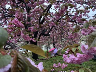 雨のお花見☂️ 着付け教室の後、先生方と造幣局の桜の花道の通り抜けに🌸種類が豊富で名前も色々お気に入りは「須磨浦普賢象」ピンクと黄緑色の花弁が美しい