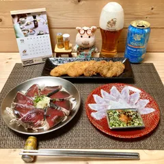 鰹のタタキ🐟 × 真フグの薄造り🐡 × チーズ入りチキンフライ🧀 × さんま大葉フライ × マリアージュブラン🍺✨ 今夜の居酒屋とんちゃん🏮は…鰹のタタキ🐟¥429 → ¥300✨🉐真フグの薄造り🐡¥537 → ¥268✨🉐チーズチキンフライ🧀¥162 → ¥81✨🉐さんま大葉フライ🐟¥162 → ¥81✨🉐マリアージュブラン🍺とともに…✨😁今夜も安くて美味しい…メニューでした🤭笑