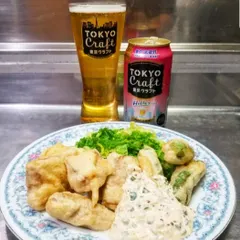 キハダマグロ、シシトウガラシのフリットを揚げました🎵衣には硬く泡立てた卵白と小麦粉を使い、ふわっと仕上がります。ピクルスたっぷりのタルタルソースをつけて頂きました。付け合わせは茹でちりめんきゃべつ。🐟😋👍今日のビールは東京クラフトヘレス キハダマグロのさっぱり優しい味わいにヘレスの優しい麦芽の味わい