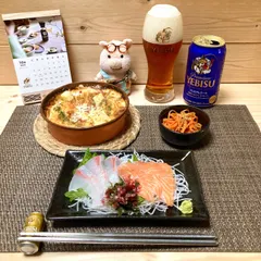 カンパチとサーモンのお刺身🐟 × チーズグラタン🧀 × ニンジンのきんぴら🥕 × プレミアムエール🍺