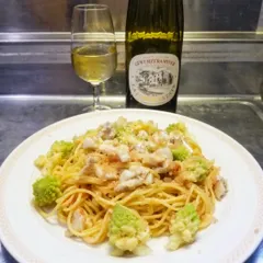 明太子スパゲッティを具だくさんで作りました。 鱈の身とロマネスコを加えてバターたっぷりで。仕上げはフィンガーライムを。バターと明太子とライム🎵相性最高です。 ワインはポールマス のゲヴェルツ🥂La Forge Estate Gewürztraminer 2023