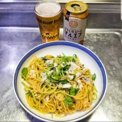🍝タチウオとクレソンのスパゲッティ🍝 タチウオとクレソンのスパゲッティ🍝を作りました。 タチウオはオリーブ油で焼いて骨を取り、味の素パスタキューブの香ばし和風醤油で味付けました。 今日はさっぱりアサヒのマルエフ で、おつかれ生です。🍺👍