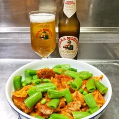 豚肉トマト煮込みにファルファッレ。スナップエンドウと一緒にいただきました🎵今回の肉はちょっと脂が多かったかなあ。ビールはイタリア🇮🇹のビッラモレッティさっぱりした飲み口と麦芽の味わいが旨いです🍺👍