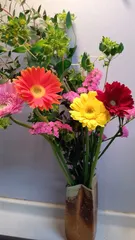 季節のお花 雪が降り寒いです。お花が暖かさを運んでくれました。ガーベラ 神秘アルストロメリア 未来への憧れかすみ草 清らかな心