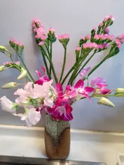 今日のお花 まだまだ暑いですね。お花を見て、少し気分転換しましょう🎶💖スプレーカーネーション 素朴デンファレ 美人かすみ草 清らかな心