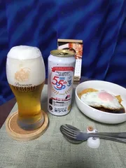 黒ラベルや◯や55周年記念缶で金のハンバーグ 目玉焼き乗せをいただきました。