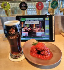 NEW 「YEBISUのための」肉団子withトマトガーリックソース 先日のYEBISU BAR エミオ石神井公園店🚃「YEBISUのための」肉団子、マスタードソースを店舗限定ランチ「チキンシュニッツェル」で使っているトマトガーリックソースに変えて😆ブラック&ゴールドなどと共に🍺