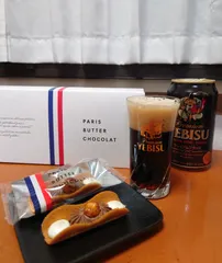 ショコラとYEBISU PARIS BUTTER CHOCOLAT/パリバターショコラバター薫るラングドシャ生地に、生食感のチョコレートと香ばしいマカダミアナッツを包みました。(H.Pより)生食感のチョコレートと黒ヱビス、美味しい。