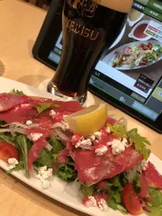 10月でメニューが少し変わりました? 10月に入って初YEBISU BAR、そしたら、メニューが所々変わってました。サラダのハーフがドレッシングを選べるので、ごぼうか玉ねぎか迷った挙句に、ビーツ&玉ねぎを注文!届いたサラダを見て🥗びっくり、そうだ、ビーツってそうだったー!お味はよろしかったです^_^