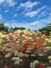 白いマンジュシャゲ マンジュシャゲは赤が定番だと思ってたんですが、白もいいですね「真夏のクリスマス」という名前のようですポーチュラカも満開黄色いのは、また新しい品種でしょうか…