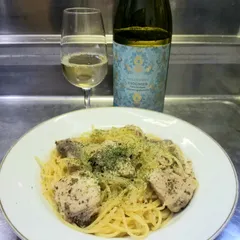 🍝メカジキのスパゲッティ🍝 メカジキをバターとオリーブ油でソテーし、スパゲッティを作りました🎵 シチリアのヴィオニエの白ワインはバターとハーブに良く合いますねえ🌿😋👍