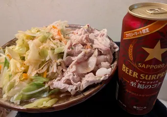 お家で男の豪快盛りラーメン🍜(サッポロ一番味噌ラーメン)!🤭 日曜日の夜!😏いつもは外でラーメンを食べているが、今日はお家で久しぶりに袋麺(サッポロ一番味噌ラーメン)が食べたくなったので…!😆豚肉しゃぶしゃぶ用(200g)とカット野菜(キャベツともやし)2袋分、袋麺は3袋分!🤣まずは3袋分の麺を茹で丼へ、その後豚肉をしゃぶしゃぶして麺の上へ!😁最後に麺を茹でた
