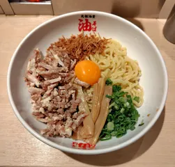 元祖油堂、油そば🍜 YEBISU BAR🍺からの八重洲地下街、東京ラーメン横丁🏮元祖油堂で油そば(大盛)、大盛といっても麺は225g🍜「チャーシュー増し・フライドオニオン・卵黄」の「+Bトッピング」😊 ⤵️そして無料のタマネギ🧅も⤵️そこへ酢と一味を投入し良く混ぜて😋お好みの味の状態に😄⤵️無料のドリンク