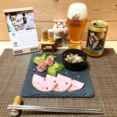 NEW パストラミハム × アーモンドフィッシュ × ヱビス🍺✨ 今夜の居酒屋とんちゃん🏮は…ちょっとBAR風に…🤭✨パストラミハム × アーモンドフィッシュ × ヱビス🍺✨パストラミハム ¥216 くらい✨🤭アーモンドフィッシュ ¥124✨お花にしてみました🌹✨安心してください…、、、他にも食べました🤭笑