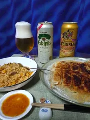 NEW チャーギョ゙ーでEdelpilsです。 今日はチャーハン、餃子でEdelpilsでした。チャーハン風と冷凍餃子でしたが、Edelpilsの苦味とよく合ったと思います。今日もネタはなくとも美味しくいただきました。ごちそうさまでした🙏😎👍。