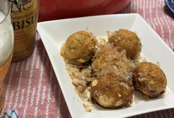 とらひっぽさんの投稿に触発されて数日、やっと実現しました。たこ焼きとヱビス。 具材はタコとネギと紅ショウガ。昔は天カスとか入れてたけど、今回はシンプルに。久しぶりなので生地の分量が良く分からなかったけど、まあ、こんなもんでしょ。取り出して、鰹節かけて頂きます。熱々のたこ焼きと冷たいヱビス、