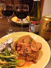 NEW 煮込みハンバーグで! 先ずは先日買っていたボジョレーヌーボーの赤を頂き、その後でYEBISUを頂きました。