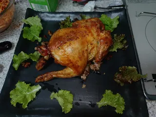 えーと 今回のチキンは、中身はチキンライスを詰めてます 外はまぁ、いつも通り、(手抜きだが)ミックスハーブを塗して、40分220℃でクルクル回転設定で放置 以上、完成(笑) 写真は、他に色々オカズ皿とかがあったから、チキン周りの飾りが質素だす(^^