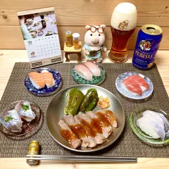 佐賀県産黒毛和牛🐃モモ肉ステーキ🥩 × お寿司🍣 × プレミアムエール🍺✨ 今夜の居酒屋とんちゃん🏮は…ご馳走メニュー🙌🤣✨お寿司🍣¥1080 → ¥486✨🉐佐賀県産黒毛和牛🐃¥550 → ¥385✨🉐佐賀県産黒毛和牛のモモ肉ステーキ🥩は…、ミニステーキ(75g)で¥385🤣✨お寿司🍣は…回転寿司みたいに盛りつけてみました🤣✨笑ご飯もお代わりしました🍚✨🤭✨笑