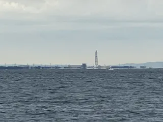 いつもの「蜃気楼」。 発生しているのを誰も気付いていない。😭そして、遠くのタンカーの下半分が消えている。🙀