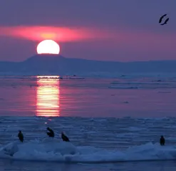 北海道/知床・羅臼沖、船からの撮影📷️国後島から昇る朝日🌄流氷とオオワシ🐦️(過去撮影画像より) あけましておめでとうございます🎍皆様、本年もどうぞよろしくお願いいたします🙇