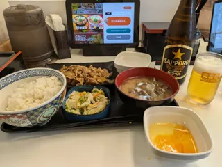 YEBISU BAR グランスタ八重北店で🍺の前、空腹に絶えかねて?ブランチに吉牛の朝牛セット😊アタマの大盛、半熟玉子&つゆだくで😄ときどきどうしても食べたくなる吉牛、やはり牛丼では一番好み、美味しい😋