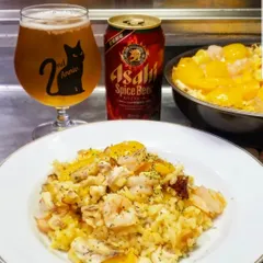 真鯛、小海老、黄パプリカでパエリアを炊きました🥘サフランをしっかり効かせて風味たっぷりです‼️今日のビールは、アサヒスパイスビール 🌶️魚介のパエリアに辛味が加わり、とても合います。特にエピ+にんにく+サフランの風味には抜群に呼応してくれました🎵🍺🦐👍