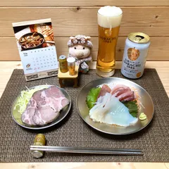 手作りハム × 半額GETのイカお刺身🦑 × ソラチ🍺